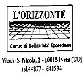 L'Orizzonte Centro di Solidarietį Eporediese, associazione di volontariato senza scopo di lucro, operante nel campo del recupero, della riabilitazione e per il reinserimento sociale dei tossicodipendenti, costituitosi in Ivrea con atto rogito del notaio Cignetti in data 24.03.1992, aderisce per finalita' e metologie alla Federazione Italiana Comunita' Terapeutiche Conseguentemente esso propone un programma educativo, in una configurazione adattata alla realtį locale nel rispetto della sperimentata articolazione in tre fasi, cui corrisponde una analoga organizzazione delle strutture, cosi' come meglio descriveremo qui di seguito. Affianca il Centro Eporediese di solidarietį l'Associazione famiglie per l'Orizzonte, la quale svolge attivo lavoro di informazione e sostegno alle famiglie dei ragazzi tossicodipendenti in programma educativo ed anche alle famiglie di coloro che ancora si trovano all'esterno o in carcere. Il lavoro dell'Associazione, a cui ci si puo' rivolgere liberamente ogni giorno dalle ore 8 alle ore 18, é svolto da volontari e famigliari di ragazzi che hanno avuto esperienza in Comunitį e si svolge principalmente con colloqui individuali e riunioni in cui vengono affrontati di volta in volta temi di interesse comune.